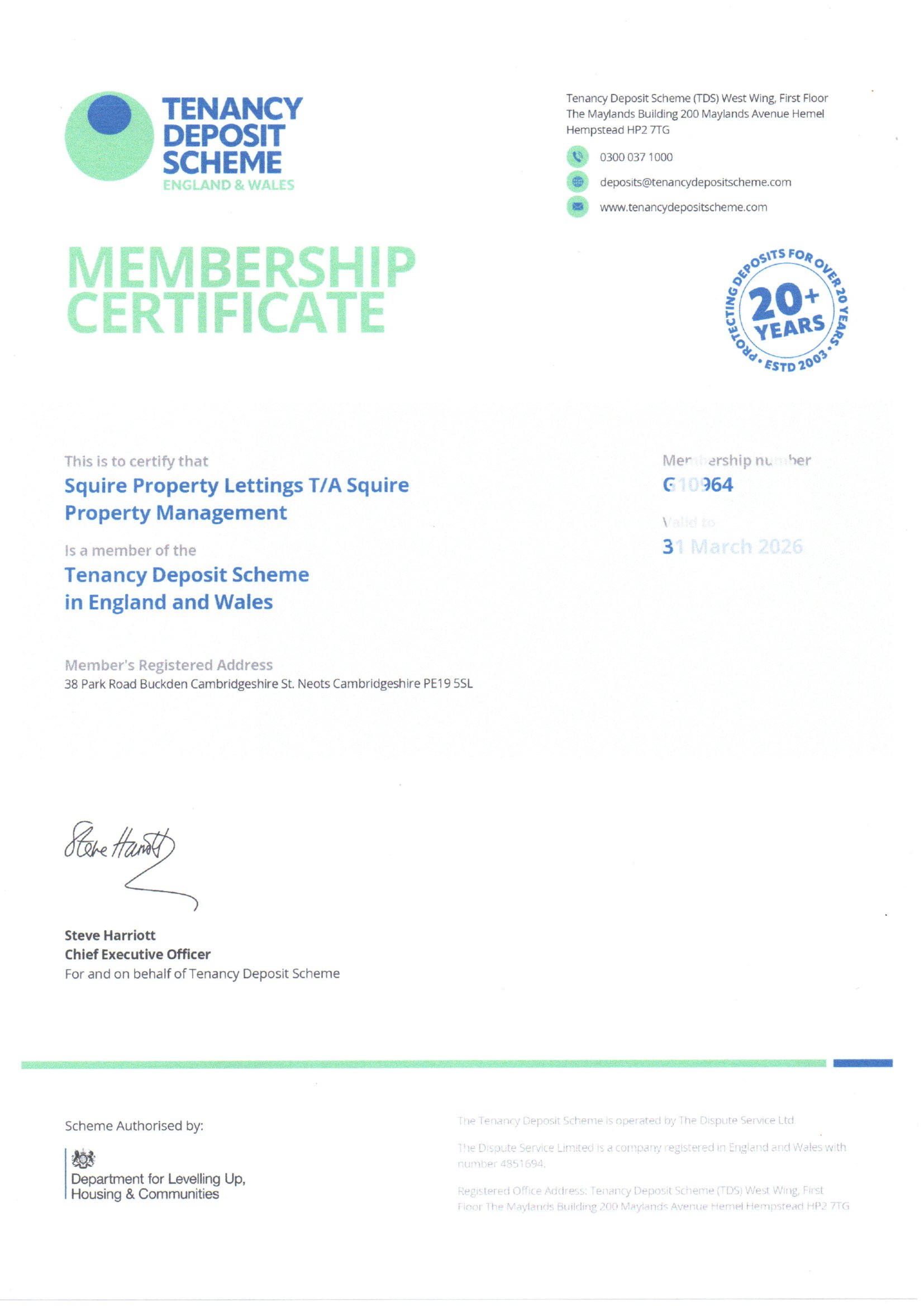 Squire Property Management are members of The Tenancy Deposit Scheme.  Membership number: G10964